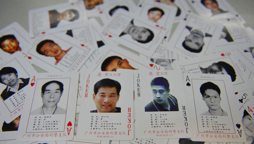 2012年4月12日,广州市公安局刑警支队创新通缉令方式,把筛选出来的54个有重案在身的通缉犯资料印制成一副特殊的扑克牌并免费派发给群众,希望以此获得更多线索。 图片来源:CFP 国际在线消息:“通缉扑克,悬赏缉拿,举报请拨110。”记者2012年4月12日获悉,广州市公安局刑警支队创新通缉令方式,把筛选出来的54个有重案在身的通缉犯资料印制成一副特殊的扑克牌并免费派发给群众,希望以此获得更多线索。据了解,广州公安此举为全省首创,也是清网行动的后续。记者了解到,这54名重案犯中,有三分之二以上的都涉嫌故意杀人。 记者看到,这副通缉扑克整体是灰色色调,由在逃嫌疑人的头像、基本信息、警方报警电话组成,其中“大小王”上明确了悬赏金额。记者注意到,整副扑克牌全部都是男性通缉犯,而2009年涉嫌杀人的公安部A级通缉犯尚少杰被印在“大王”上,并明确了悬赏金为30万。印在“小王”位置的是一名无名氏,案别是持枪抢劫杀人,立案单位则是刑警支队,悬赏金额为5万。